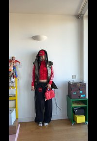 • Person trägt eine rote Adidas-Jacke und -Kappe, eine Tarnmuster-Kapuzenweste, schwarze weite Hosen, weiße High-Top-Sneaker und hält in Innenräumen eine kleine rote Adidas-Handtasche.