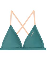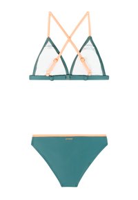 Türkisfarbener Bikini mit pfirsichfarbenem Besatz, Dreieck-Top mit gekreuzten Trägern und passende Low-Rise-Höschen mit Markenetiketten.