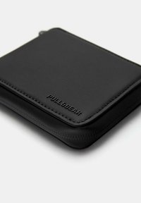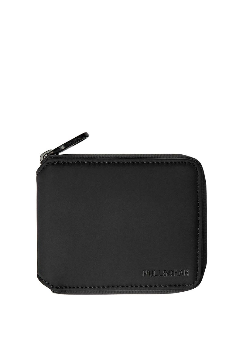 Schwarzer rechteckiger Reißverschluss-Geldbeutel mit abgesteppten Kanten und geprägtem "PULL&BEAR"-Logo in der unteren rechten Ecke vorne.