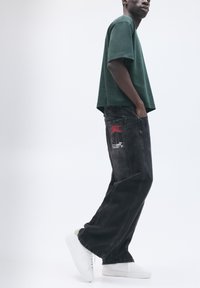 Mann steht mit Händen in den Taschen, trägt ein dunkelgrünes Hemd, schwarze Jeans mit grafischem Aufnäher und weiße Sneakers auf weißem Hintergrund.
