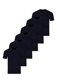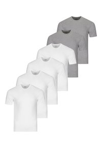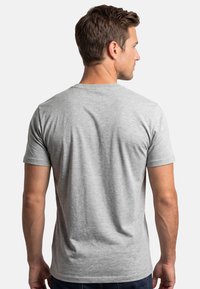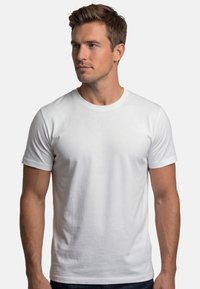 Mann mit kurzen braunen Haaren, trägt ein einfaches weißes T-Shirt mit kurzen Ärmeln, schaut leicht nach links vor einem weißen Hintergrund.