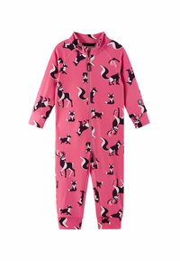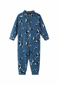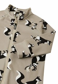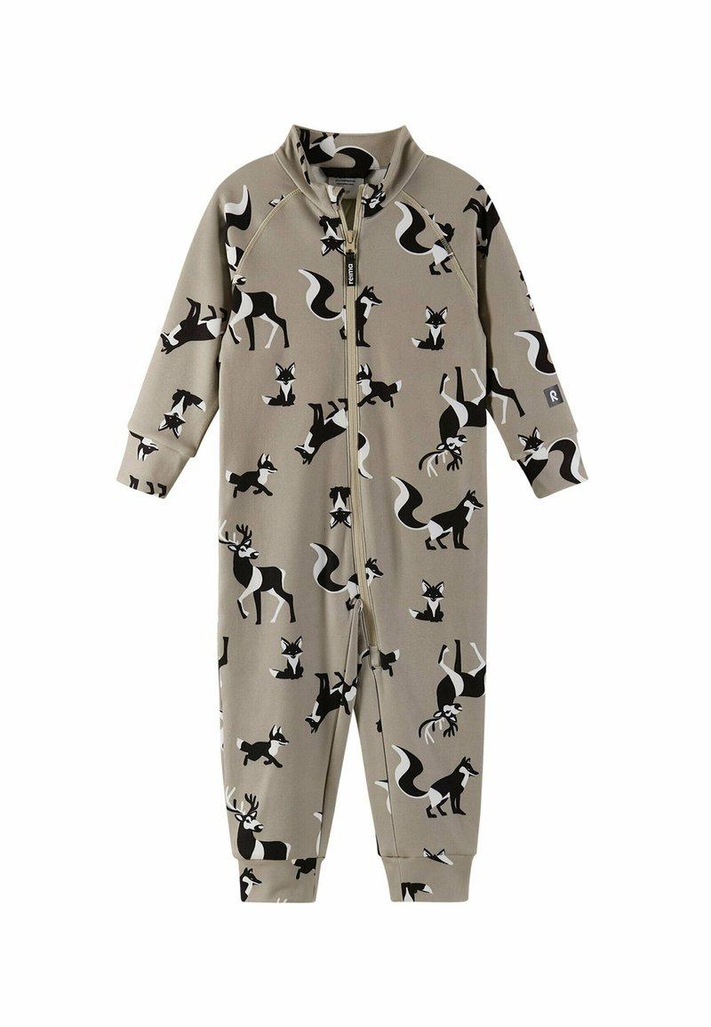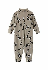 Brauner Jumpsuit mit einem Muster aus schwarzen und weißen Tieren, darunter Füchse und Rehe. Er hat lange Ärmel und einen zentralen Reißverschluss.