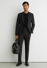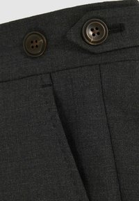 Dunkelgraue, maßgeschneiderte Hose mit glatter Textur, schmaler Passform, flacher Vorderseite, Gürtelschlaufen und zwei Knöpfen am Bund.