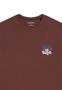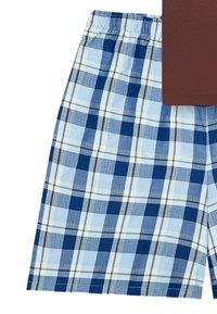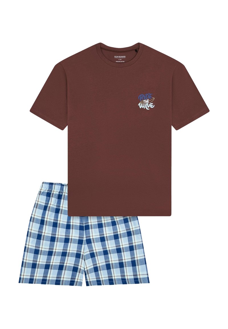 Braunes Baumwoll-T-Shirt mit dem Schriftzug "RIDE THE WAVE" in Blau und Weiß. Kombiniert mit karierten Shorts in Blau, Hell- und Dunkeltönen, mit elastischem Bund.