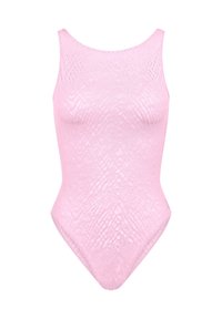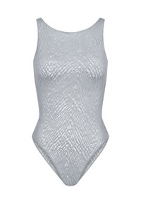 Frau in einem ärmellosen, strukturierten, hellgrünen Einteiler-Badeanzug, steht mit entspannten Händen an den Seiten und schaut leicht nach links.