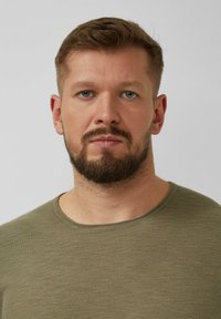 Mann mit Bart, der einen olivgrünen Pullover mit langen Ärmeln und dunkle Hosen trägt, steht mit einer Hand in der Tasche vor einem einfarbigen Hintergrund.