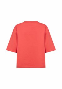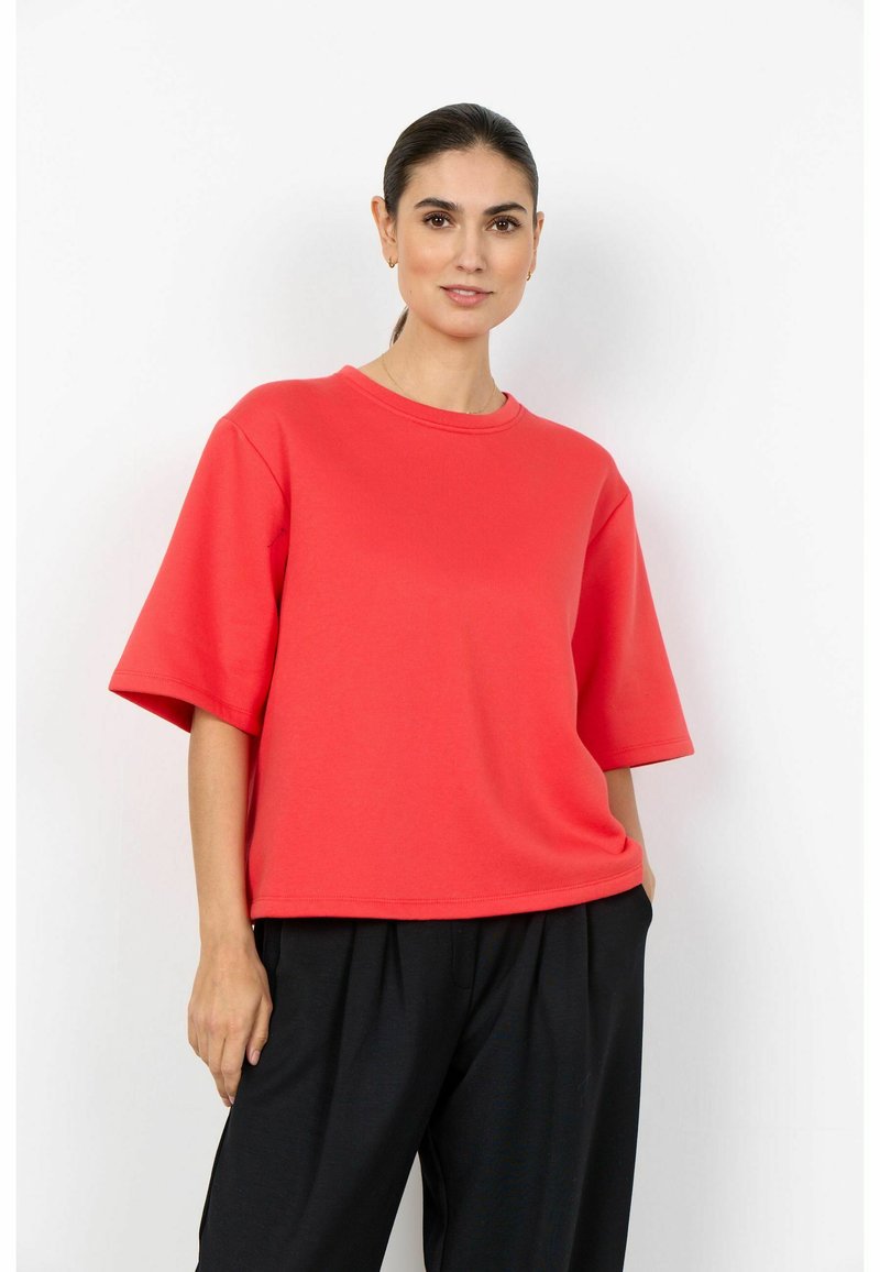 Frau mit zurückgebundenen dunklen Haaren, die ein locker sitzendes rotes Kurzarmshirt und schwarze Hose trägt, steht mit einer Hand in der Tasche vor einem weißen Hintergrund.