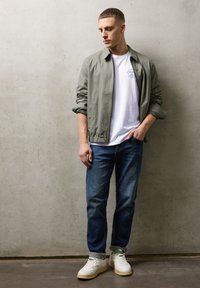 Junger Mann mit kurzen Haaren, trägt ein weißes T-Shirt mit kleinem Text auf der Brust und blaue Jeans, Hände in den Taschen, schaut nach links.