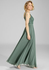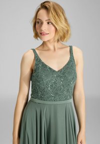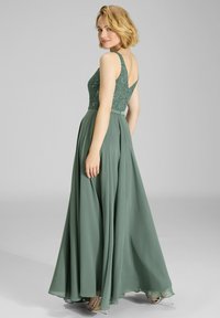 Langes grünes Kleid mit einem Spitzenoberteil mit Verzierungen und einem fließenden Rock. Spaghettiträger und ein V-Ausschnitt-Design betonen die Silhouette.