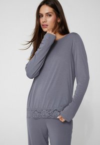 Frau steht barfuß und trägt einen langärmligen grauen Pyjama mit Spitzenbesatz am Saum und an den Hosenbeinen vor einem schlichten Hintergrund.