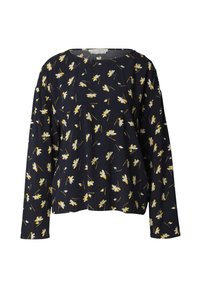 Langärmliges senfgelbes Oberteil aus glattem Stoff mit Rundhalsausschnitt und geknöpften Akzenten an den Schultern, kombiniert mit dunkelgrünen Hosen.