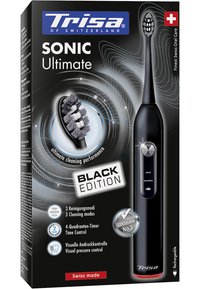 TRISA Sonic Ultimate Black Edition – die nächste Generation der TRISA Schallzahnbürsten. SMART DISPLAY: Anzeige für den gewählten Reinigungsmodus und Ladezustand. 3 REINIGUNGSMODI: Die Zähne und das Zahnfleisch werden mit drei verschiedenen Programmen zuverlässig und gründlich gereinigt. VISUELLE DRUCKKONTROLLE: Wenn zu viel Druck ausgeübt wird, leuchtet die Anzeige auf für effektive und sanfte Reinigung. ZEITKONTROLLE: Automatische ZEITKONTROLLE signalisiert alle 30 Sekunden den Bereich zu wechseln. Nach zwei Minuten zeigt eine längere Unterbrechung an, dass die von Zahnärzten empfohlene Putzzeit erreicht wurde. Für zuverlässiges Putzen, jedes Mal. BATTERIE: Eine Batterieladung reicht für eine extra lange Betriebsdauer von bis zu 2 Wochen Putzen (2x2 Minuten pro Tag). AUFSTECKBARE BÜRSTE: Besonders feine Borsten sorgen für gleichzeitig sanfte und gründliche Reinigung. Dank der kompakten und dünnen Form des Bürstenkopfes können auch schwer erreichbare Stellen gut gereinigt werden.