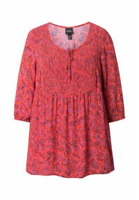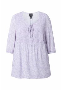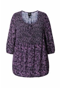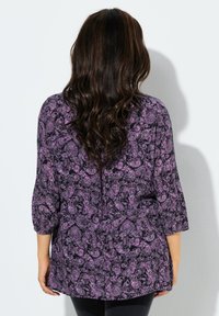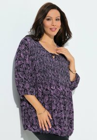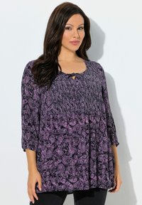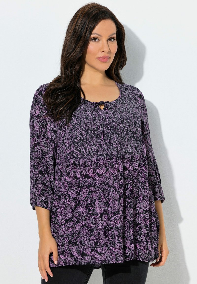 Frau trägt eine lockere lila Bluse mit Paisley-Muster und Dreiviertelärmeln, steht vor einer schlichten hellen Wand.