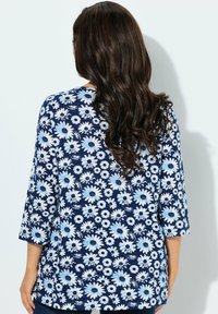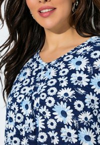 Frau mit langen dunklen Haaren, die silberne Creolen und ein marineblaues Oberteil mit einem hellblauen und weißen Gänseblümchenmuster trägt, steht vor einer weißen Wand.