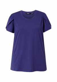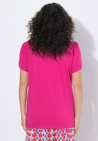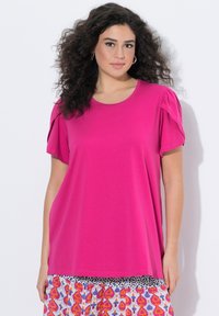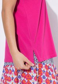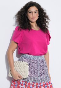 Frau mit lockigem Haar trägt ein knallpinkes Kurzarmoberteil und einen mehrfarbig gemusterten Rock und steht vor einem weißen Hintergrund.