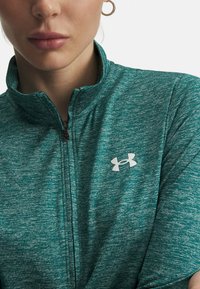 Tealfarbener, langärmeliger Sport-Quarter-Zip-Pullover aus strukturiertem Stoff, mit hohem Kragen und einem weißen Logo auf der linken Brust.