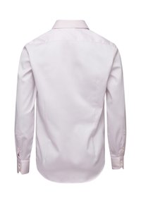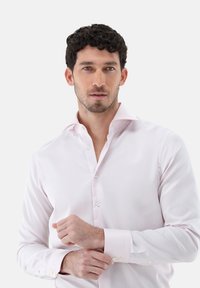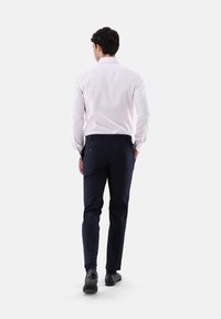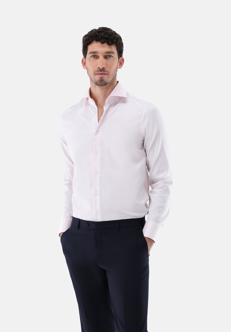 Helles rosa Hemd mit klassischem Kragen, Knopfverschluss vorne und langen Ärmeln, kombiniert mit marineblauen Hosen für den Kontrast. Glattes Baumwollmaterial.