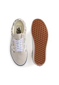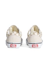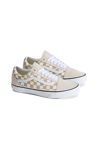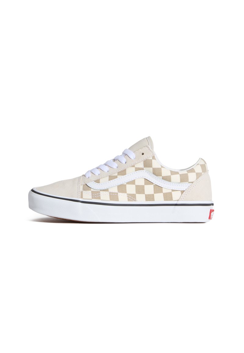 Beige Segeltuch-Sneaker mit Schachbrettmuster und weißen Akzenten. Verfügt über weiße Schnürsenkel, eine runde Zehenpartie und eine Gummisohle mit schwarzem Rand.