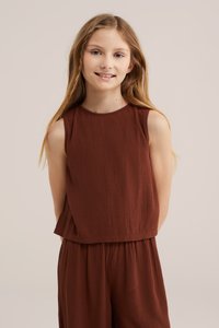 Mädchen mit langem blondem Haar, lächelnd, trägt ein ärmelloses, strukturiertes braunes Oberteil und passende Hose, steht vor einem neutralen Hintergrund.