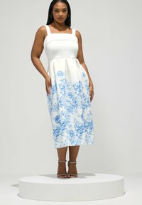 Frau trägt ein ärmelloses weißes Midikleid mit blauen Blumenmustern, steht in silbernen hochhackigen Sandalen vor einem einfarbigen Hintergrund.
