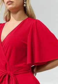 Frau, die in einem fließenden roten Maxikleid mit flatternden Ärmeln, V-Ausschnitt, Knopfdetails und silbernen offenen Absätzen vor weißem Hintergrund steht.