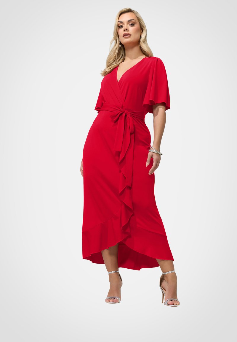 Frau trägt ein rotes Wickelkleid mit flatternden Ärmeln, Taillengürtel, gestuftem Saum mit hohem und niedrigem Abschluss und silbernen High-Heel-Sandalen, steht vor weißem Hintergrund.
