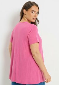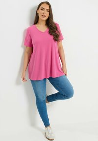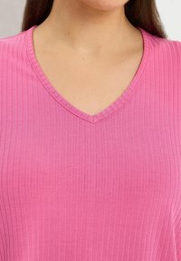 Frau mit langem, welligem Haar, die ein geripptes, kurzärmliges, rosa V-Ausschnitt-Oberteil und blaue Jeans trägt, steht vor einem schlichten hellen Hintergrund.